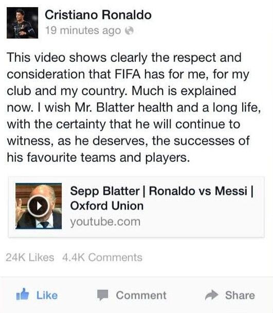 Ο Μπλάτερ δήλωσε σε ομιλία του στο πανεπιστήμιο της Οξφόρδης ότι ο Ρονάλντο δαπανά στον κομμωτή του περισσότερα χρήματα από τον Λιονέλ Μέσι. Ο αρχηγός της εθνικής Πορτογαλίας, μέσω της σελίδας του στο Facebook, απάντησε στον πρόεδρο της FIFA, επισυνάπτοντας και το βίντεο των δηλώσεών του.