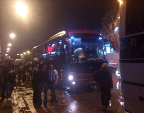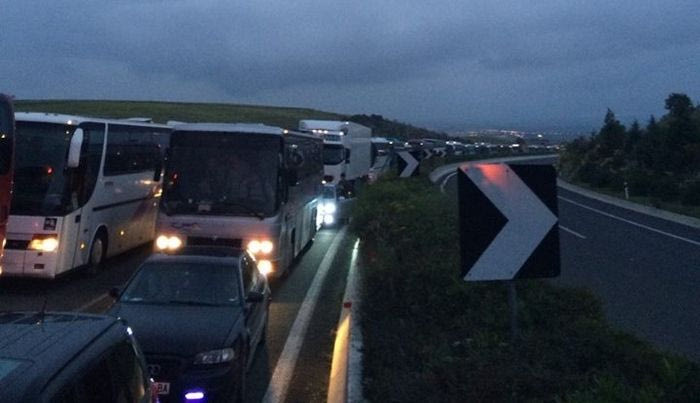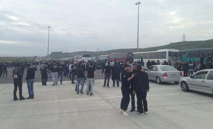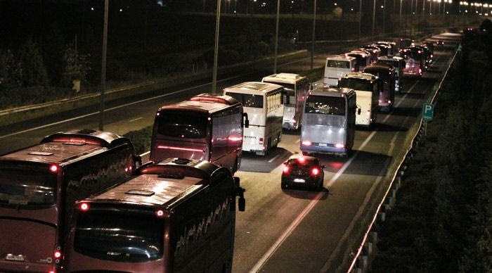 12:20: Τα πρώτα πούλμαν περιμένουν στα διόδια των Αφιδνών. Πιο πίσω κάποια πούλμαν έχουν κάνει στάση και οι οπαδοί έχουν στήσει πάρτι, φωνάζοντας συνθήματα.