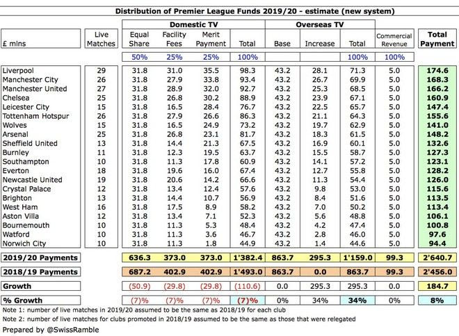Οι αποφάσεις που ελήφθησαν την προηγούμενη εβδομάδα σημαίνουν ότι η Λίβερπουλ είναι πρωταθλήτρια τηλεοπτικών εσόδων και τη φετινή σεζόν, όμως όχι οριακά όπως πέρυσι. Αιτία το γεγονός ότι από αυτόν τον κύκλο (2019-2022) άλλαξε ο τρόπος διαμοιρασμού των εσόδων από τις τηλεοπτικές συμφωνίες με κανάλια του εξωτερικού. Μέχρι πέρυσι, τα συγκεκριμένα έσοδα μοιράζονταν ισομερώς στους 20 συλλόγους, ωστόσο από φέτος οι σύλλογοι θα πάρουν το fixed περσινό ποσό και οποιαδήποτε αύξηση θα μοιραστεί ανάλογα με τη θέση που κατέλαβαν στην τελική βαθμολογία σεζόν.