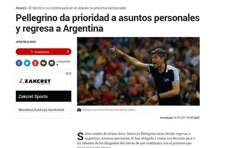 Σύμφωνα με τους Ισπανούς, ο Μαουρίτσιο Πελεγκρίνο αποφάσισε να επιστρέψει στην Αργεντινή για προσωπικούς λόγους. Μάλιστα χρησιμοποιεί την έκφραση “εκτός συγκλονιστικού απροόπτου”. Σχεδόν σίγουρο το έχει η “Marca” με λίγα λόγια.