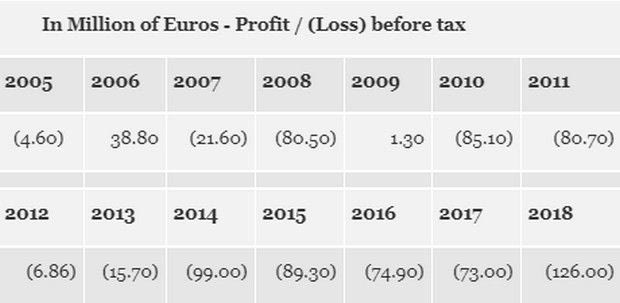Έκτοτε, κάθε ισολογισμός βρισκόταν στο ‘κόκκινο’, με τις ζημίες να εκτοξεύονται. Το 2012-2013 έφτασαν τα 15.700.000 ευρώ, το 2014 άγγιξαν για πρώτη φορά εννιαψήφιο ποσό (99.000.000 ευρώ), το 2014-2015 ανήλθαν σε 89.300.000 ευρώ, το 2015-2016 σε 74.900.000 ευρώ, το 2016-2017 σε 73.000.000 ευρώ για να έρθει το τελευταίο ρεκόρ.