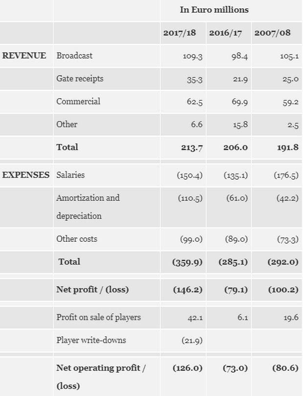 Τα έσοδα από τις ραδιοτηλεοπτικές μεταδόσεις ανήλθαν σε 109.300.000 ευρώ το 2017-2018, αυξημένα κατά περίπου 11.000.000 ευρώ σε σχέση με το 2016-2017. Αύξηση παρουσιάστηκε και στα έσοδα από τα εισιτήρια, εξαιτίας της αίσθησης ενός νέου ξεκινήματος στον κόσμο, ωστόσο τα εμπορικά έσοδα μειώθηκαν, μετά από την αποχώρηση της Adidas από την ομάδα. Συνολικά, τα έσοδα ανήλθαν σε 213.700.000 ευρώ σε σχέση με τα 206.000.000 ευρώ του 2016-2017, ωστόσο το ανησυχητικό κομμάτι είναι ότι παραμένουν στο επίπεδο που ήταν πριν από μία δεκαετία, αφού το 2007-2008 ο σύλλογος παρουσίασε έσοδα 191.800.000 ευρώ.