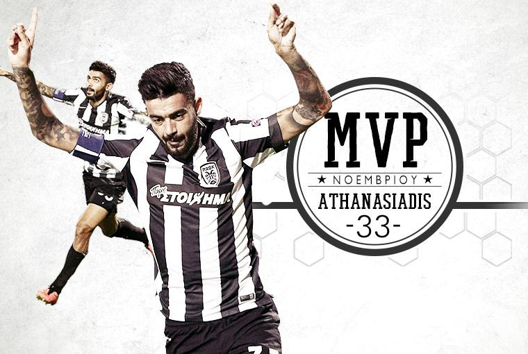 Ο Ράζβαν Ρατς μετά από τρεις απανωτές κατακτήσεις… παραδίδει τον τίτλο του MVP. Πλέον, ήρθε η ώρα το βραβείο να καταλήξει και σε κάποια άλλα χέρια. Για τον μήνα Νοέμβριο λοιπόν πολυτιμότερος είναι ο Στέφανος Αθανασιάδης σύμφωνα με την τις ψήφους των φιλάθλων του Δικεφάλου. Μέσα στον προηγούμενο μήνα ο Κλάους σκόραρε τέσσερα τέρματα (δύο κόντρα στον Εργοτέλη στο Παγκρήτιο και δύο στην παγωμένη Λευκορωσία κόντρα στην Ντιναμό Μινσκ) και συνέβαλε τα μέγιστα για την πορεία του ΠΑΟΚ.