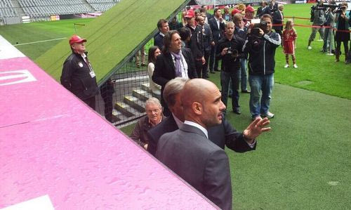 Η παρουσίαση του Πεπ Γκουαρδιόλα ολοκληρώθηκε με την παράδοση μίας προπονητικής φόρμας, ενώ στη συνέχεια ο νέος τεχνικός της Μπάγερν βγήκε στον αγωνιστικό χώρο της “Αλιάνζ Αρίνα” και έπαιξε πασούλες με τη μασκότ της ομάδας, προτού δεχθεί ένα μπουκέτο λουλούδια.