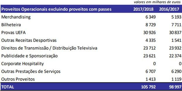 Στα έσοδα από την Altice προστίθενται 15.250.000 ευρώ από την UEFA και 2.800.000 ευρώ από τη Unicer (χορηγός), ωστόσο η βασική πηγή για ακόμα μία χρονιά ήταν το ίδιο το ποδοσφαιρικό τμήμα.