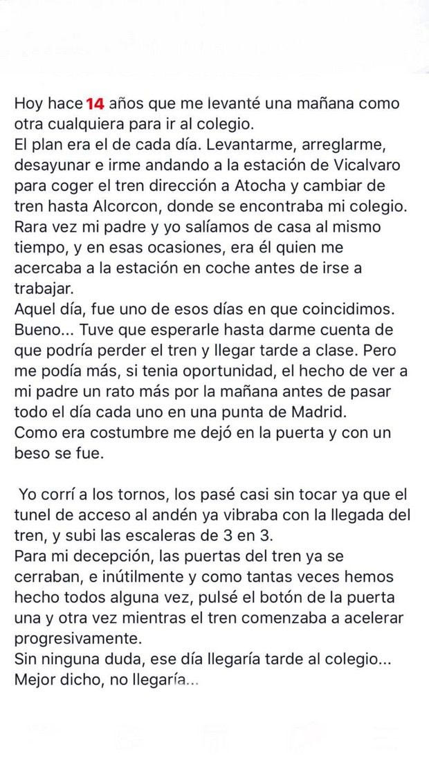“14 χρόνια πριν ξύπνησα λες και ήταν μία ακόμα ημέρα. Πήγαινα στο σχολείο και σχεδίαζα να περπατήσω μέχρι τον σταθμο Vicalvaro που ήταν το σχολείο μου. Σπάνια φεύγαμε μαζί από το σπίτι εγώ και ο πατέρας μου αλλά εκείνη την ημέρα με πήγε μέχρι το σταθμό”, δήλωσε αρχικά ο 32χρονος πλεον κίπερ για εκείνη την περιπέτειά του, και συνέχισε:
