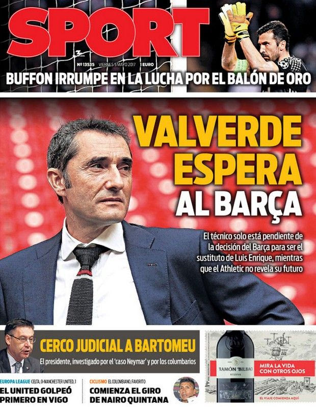 “Ο Βαλβέρδε περιμένει την Μπαρτσελόνα”, είναι ο τίτλος στο πρωτοσέλιδο της καταλανικής “Sport” η οποία έχει μεγάλη φωτογραφία του Βαλβέρδε, με το εν λόγω μέσο να υποστηρίζει πως ο τεχνικός της Μπιλμπάο θα φύγει από τους Βάσκους στο φινάλε της σεζόν και περιμένει την απόφαση των διοικούντων την “Μπάρσα” για το αν θα είναι αυτός τελικά τον οποίο θα εμπιστευτούν για να διαδεχτεί τον Λουίς Ενρίκε.