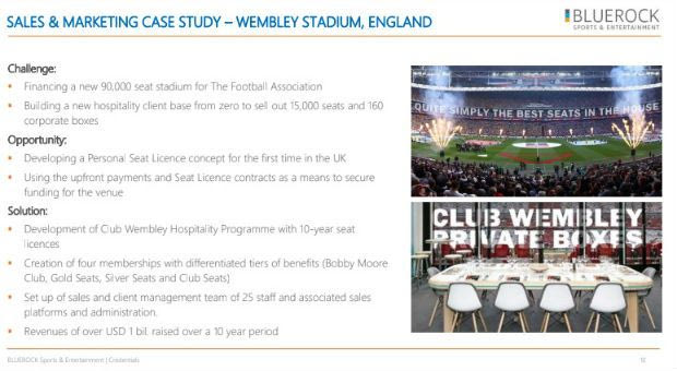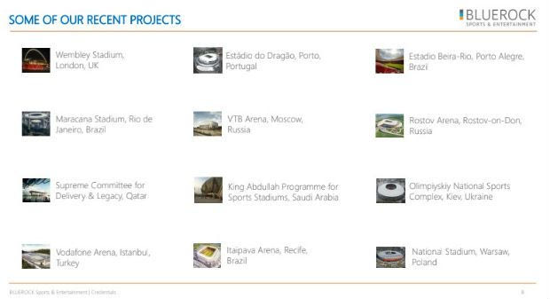 Η BLUEROCK, αποτελεί το δεύτερο κομμάτι στο “παζλ” και θεωρείται η μεγαλύτερη εταιρία στον κόσμο σε OPERATION -IMPLEMENTATION -MANAGEMENT- EVENT STADIUM. Αξίζει να σημειωθεί ότι η Bluerock έχει κληθεί από την κυβέρνηση της Κίνας για να δουλέψει πάνω σε 12 σύγχρονα ποδοσφαιρικά γήπεδα. Έχει… βοηθήσει σε σχέδια που αφορούσαντο Dragao, την VTB Arena στη Μόσχα, την Vodafone Arena της Μπεσίκτας και έχει εμπλακεί στα πρότζεκτ για το Γουέμπλει του Λονδίνου, το Μαρακανά του Rio de Janeiro, αλλά και σε διοργανώσεις όπως το Παγκόσμιο Κύπελλο, το Euro και το Champions League.