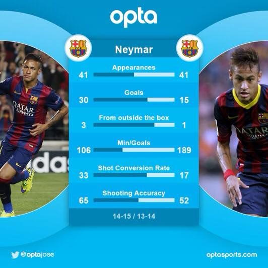 Την τρέχουσα σεζόν, ο Νεϊμάρ έχει δικαιώσει πλήρως τους φίλους της Μπαρτσελόνα, αφού σε 41 εμφανίσεις μέχρι στιγμής έχει ήδη 30 τέρματα, δηλαδή τα διπλάσια συγκριτικά με πέρυσι.