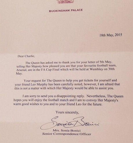 Εισιτήρια δεν έλαβε, έλαβε όμως απαντητικό γράμμα από το γραφείο της Βασίλισσας.