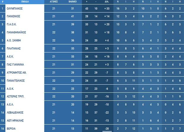 Αναλυτικά η βαθμολογία σε 22 αγωνιστικές: