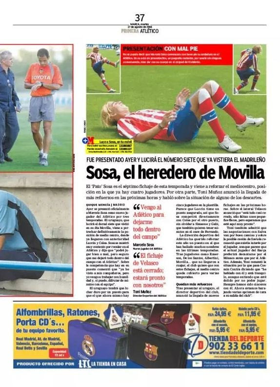 Μια ωραία ιστορία έφερε στο προσκήνιο η ισπανική “Marca”, η οποία θυμήθηκε την παρουσίαση του Πάτο Σόσα το 2004 από την Ατλέτικο Μαδρίτης η οποία είχε εξελιχθεί σε… φιάσκο. Κι αυτό γιατί ο Ουρουγουανός μέσος που είχε φτάσει στους “ροχιμπλάνκος” από την Σπαρτάκ Μόσχας, κατάφερε να… πέσει κάνοντας ποδαράκια κατά την παρουσίασή του.