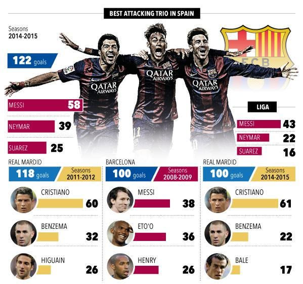 Η τριάδα της επίθεσης της Μπαρτσελόνα, Μέσι-Σουάρες και Νεϊμάρ, έχει καταφέρει να σκοράρει φέτος 122 γκολ, με πολλούς να μιλούν ήδη για την καλύτερη συνεργασία στην ιστορία.