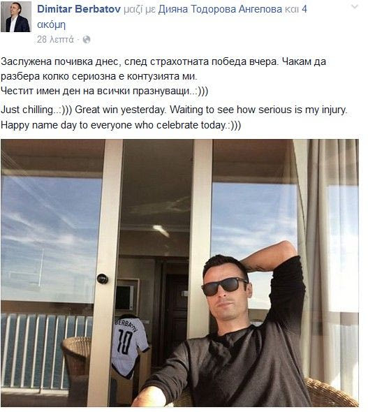 Το μεγάλο αστέρι του ΠΑΟΚ, Ντίμιταρ Μπερμπάτοφ, με ανάρτησή του στο facebook, εξέφρασε την ικανοποίησή του για τη νίκη επί του Παναθηναϊκού, ενώ παράλληλα τόνισε πως περιμένει τα αποτελέσματα των ιατρικών εξετάσεων για να δει το μέγεθος του τραυματισμού του.