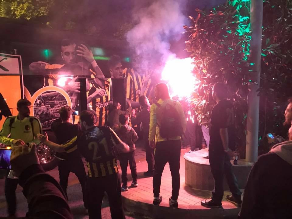 Αρκετοί οπαδοί της Ένωσης συγκεντρώθηκαν αργά το βράδυ της Πέμπτης (13/4) έξω από το ξενοδοχείο που κατέλυσε η ομάδα προκειμένου να την αποθεώσουν.