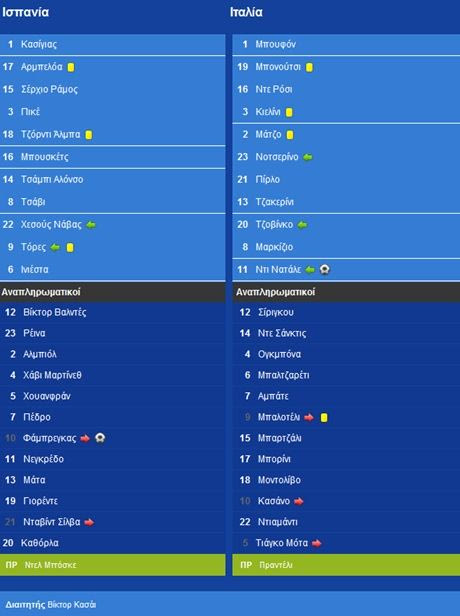 Ποιος θα σκεφτόταν μία Ισπανία χωρίς επιθετικούς ή μία Ιταλία χωρίς αμυντικούς; Οι προπονητές των 2 ομάδων είναι η απάντηση, οι οποίοι παρέταξαν 2 ιδιόμορφα συστήματα, διατηρώντας, πάντως, το βασικό χαρακτήρα σε “φούρια ρόχα” και “σκουάντρα ατζούρα”. Το passing game ήταν για ακόμα μία φορά προπύργιο των πρωταθλητών κόσμου του 2010 και το πάθος, πασπαλισμένο στη στιβαρή αμυντική λειτουργία ήταν αυτό των προκατόχων τους στο Μουντιάλ. Απόντος “φουνταριστού”, Τσεσκ Φάμπρεγας και Ντάβιντ Σίλβα έπαιζαν εναλλάξ το ρόλο κρυφού κυνηγού, αλλά δίχως να ανησυχήσουν τον εξαιρετικό… στόπερ Ντανιέλε ντε Ρόσι.