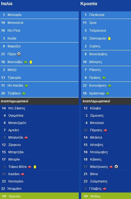 Ενα ματς που είχε ρυθμό και ευκαιρίες. Κυρίως από την Ιταλία που είχε 11 τελικές εναντίον 3 των Κροατών. Είχε και γκολ. Από την ομάδα του Πραντέλι και συγκεκριμένα από τον Πίρλο. Μη ρωτήσετε πως. Εκτέλεση φάουλ στο 39′ και ο Πλετίκοσα μάζεψε για πρώτη φορά τη μπάλα από τα δίχτυα του.