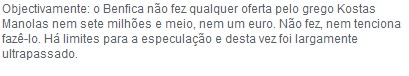 Η Μπενφίκα, με καυστική ανακοίνωσή της, ξεκαθάρισε ότι ουδέποτε έκανε πρόταση στον Μανωλά και δεν θα κάνει στο μέλλον, καθώς όπως αναφέρει, δεν θα έδινε ούτε ένα ευρώ για αυτόν τον παίκτη, πόσο μάλλον 7.500.000.