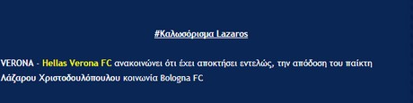 Γι’ αυτό και προέκυψε το εξής αποτέλεσμα: “VERONA – Hellas Verona FC ανακοινώνει ότι έχει αποκτήσει εντελώς, την απόδοση του παίκτη Λάζαρου Χριστοδουλόπουλου κοινωνία Bologna FC”.