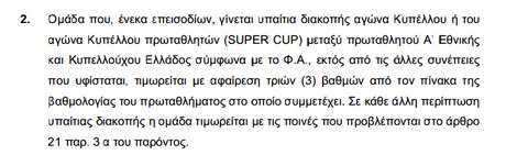 Αφαίρεση τριών βαθμών για την ομάδα που είναι υπαίτια διακοπής αγώνα κυπέλλου προβλέπει ο ΚΑΠ και η ΑΕΚ μοιάζει δύσκολο να γλιτώσει την τιμωρία.