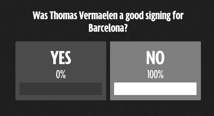 Ωστόσο, στην ψηφοφορία που διεξάγει η βρετανική “Mirror” για το αν κρίνουν οι αναγνώστες θετική τη μεταγραφή του Βερμάλεν στην Μπαρτσελόνα, η απάντηση είναι ομόφωνη: