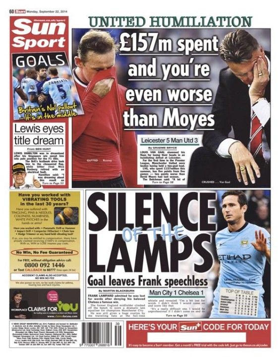 Με τη γλώσσα των αριθμών και παρά την οξύτητα του τίτλου, η εφημερίδα έχει ένα δίκιο. Μετά από πέντε αγωνιστικές στην Premier League, η ομάδα του Φαν Χάαλ έχει συγκεντρώσει μόλις 5 βαθμούς, δύο λιγότερους σε σχέση με την περσινή επίδοση του Μόγες στον ίδιο αριθμό παιχνιδιών.