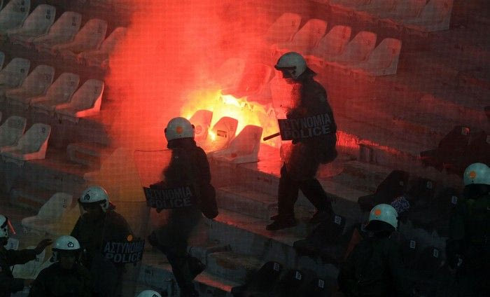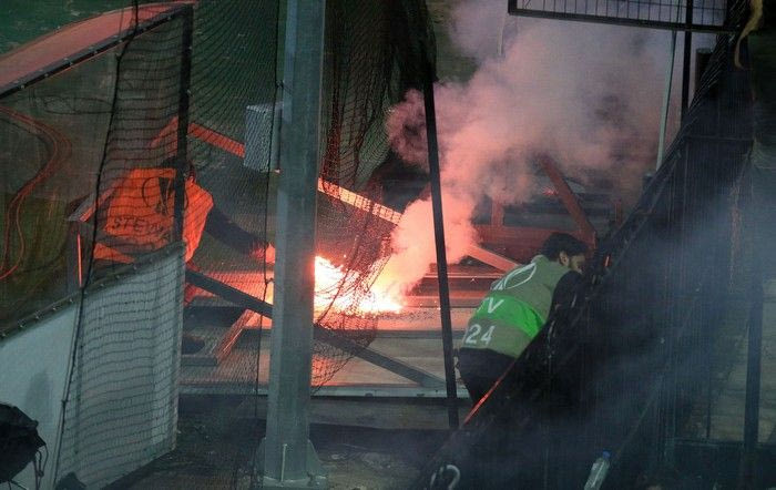 Το ματς διεκόπη για λίγα λεπτά, προκειμένου να εκτονωθεί η ένταση και να σβήσουν τα καπνογόνα που πέταξαν οι οπαδοί που βρίσκονταν στη θύρα των φιλοξενούμενων.