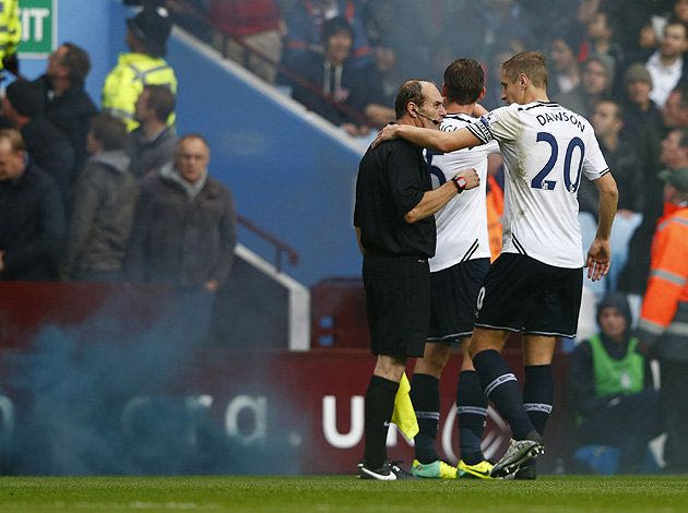 Ένα καπνογόνο τραυμάτισε ελαφρά τον βοηθό διαιτητή Ντέιβιντ Μπράιαν στην αναμέτρηση της Άστον Βίλα με την Τότεναμ στο "Βίλα Παρκ", με αποτέλεσμα το παιχνίδι να διακοπεί για αρκετά λεπτά.