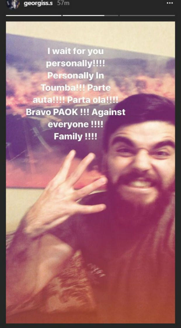 Στο πρώτο, σχηματίζοντας τον αριθμό τέσσερα με τα δάχτυλα του ο γιος του μεγαλομετόχου της ΠΑΕ έγραψε: ” Σας περιμένω προσωπικά στην Τούμπα“, εννοώντας κατά πάσα πιθανότητα τον Ολυμπιακό.