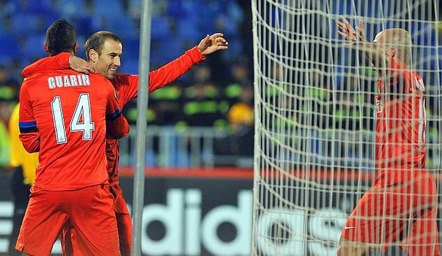Inter Milan's Rodrigo Palacio (2nd L) celebrates after scoring a goal, with his teammates Fredy Guarin (L) and Esteban Cambiasso (R), during the UEFA Europa League group H football match Partizan Belgrade vs FC Internazionale Milano, in Belgrade on November 8, 2012. AFP PHOTO / ANDREJ ISAKOVIC AFP