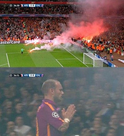 Η Άρσεναλ επικράτησε με 4-1 της Γαλατασαράι στο “Έμιρεϊτς”, με τον Ντάνι Γουέλμπεκ να σκοράρει το πρώτο χατ-τρικ της καριέρας του. Ωστόσο, μετά το δεύτερο γκολ του Άγγλου οι οπαδοί της Γαλατά εμφανώς απογοητευμένοι από την εξέλιξη του αγώνα, άρχισα να πετούν καπνογόνα μέσα στον αγωνιστικό χώρο.