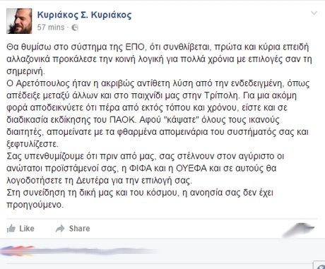“Θα θυμίσω στο σύστημα της ΕΠΟ, ότι συνθλίβεται, πρώτα και κύρια επειδή αλλαζονικά προκάλεσε την κοινή λογική για πολλά χρόνια με επιλογές σαν τη σημερινή.