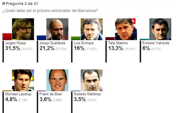 Ο Γίργκεν Κλοπ συγκεντρώνει τις περισσότερες προτιμήσεις των φίλων της Μπαρτσελόνα για την επόμενη ημέρα στον πάγκο των "μπλαουγκράνα".