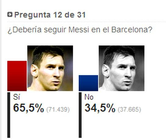 Ενδιαφέρον παρουσιάζει τέλος το αποτέλεσμα στην ερώτηση αν “θέλετε να συνεχίσει ο Μέσι στην Μπαρτσελόνα”. Το 34,5% του κόσμου απαντά πως όχι, νούμερο αν μην τι άλλο μεγάλο και εντυπωσιακό!