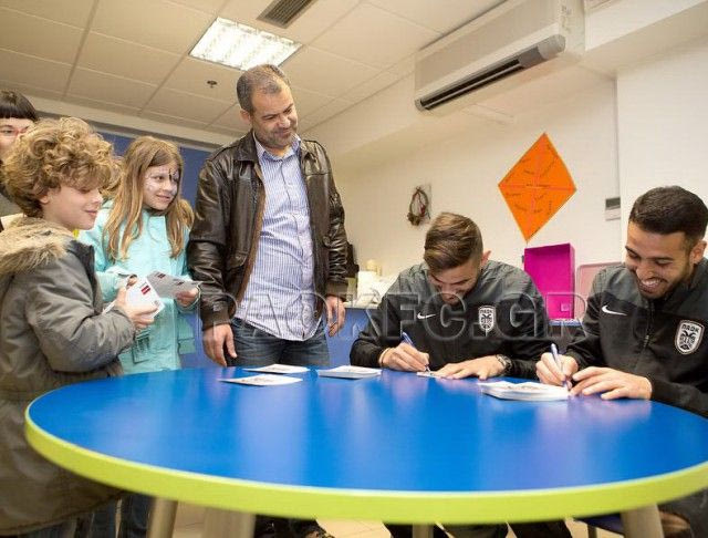Οι δύο παίκτες αφού ξεναγήθηκαν στους χώρους του Συλλόγου μπήκαν στην αίθουσα όπου πραγματοποιήσουν τις δραστηριότητές τους τα παιδιά, συνομίλησαν και φωτογραφήθηκαν μαζί τους ενώ αυτά δεν σταμάτησαν να τους αγκαλιάζουν και να απολαμβάνουν την παρουσία των δύο ποδοσφαιριστών.