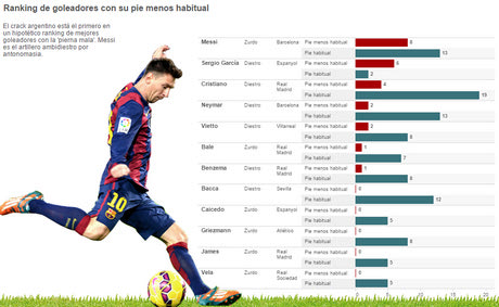 Το αστέρι της Μπαρτσελόνα, μπορεί να στείλει την μπάλα στα δίχτυα με το δεξί σχεδόν με την ίδια ευκολία που μπορεί και με το αριστερό. Συγκεκριμένα, ο Αργεντινός έχει σημειώσει τη φετινή σεζόν στην Ισπανία 13 γκολ χρησιμοποιώντας το καλό του πόδι και άλλα 8 με το… κακό, τα διπλάσια δηλαδή από εκείνα που έχει πετύχει ο Κριστιάνο Ρονάλντο.
