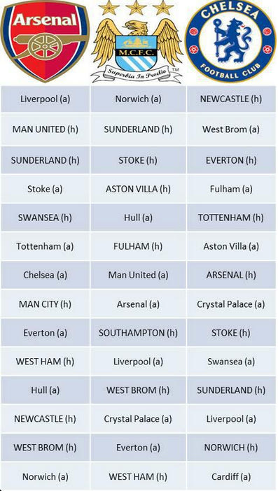 Δείτε στο παρακάτω γράφημα τους αγώνες που έχει να δώσει κάθε μία από τις τρεις διεκδικήτριες του τίτλου, μέχρι το τέλος της σεζόν και ψηφίστε την ομάδα που πιστεύετε ότι θα καταφέρει να βρεθεί στην κορυφή με τη λήξη της φετινής Premier League.
