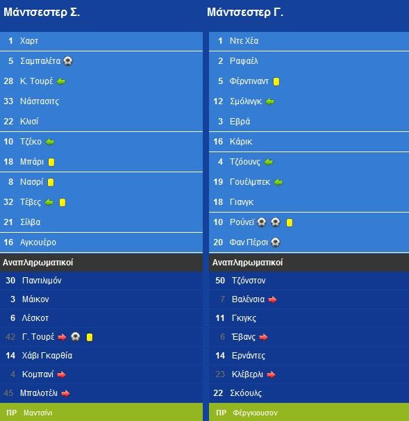 Σε ένα από τα καλύτερα ημίωρα στη φετινή σεζόν, οι “πολίτες” άσκησαν ασφυκτική πίεση στους “κόκκινους διαβόλους”, οι οποίοι με τη σειρά τους χτυπούσαν διαρκώς στην κόντρα. Ένα δοκάρι του Ντάβιντ Σίλβα προειδοποίησε για τη συνέχεια και στο 86ο λεπτό ο Πάμπλο Σαμπαλέτα ισοφάρισε μετά από κόρνερ. Παρά τους πανηγυρισμούς των πρωταθλητών Αγγλίας, μία κόντρα σε φάουλ του Φαν Πέρσι στο 91ο λεπτό έδωσε εκ νέου προβάδισμα στους πρωτοπόρους της Premier League, που αύξησαν στους 6 τους βαθμούς διαφοράς από τους γείτονές τους, στη μάχη του τίτλου.