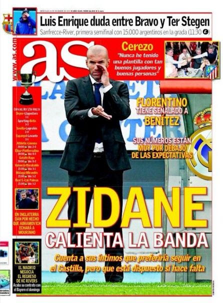 Την ίδια στιγμή, η “AS, επίσης φίλα προσκείμενη στη Ρεάλ, αλλά με λιγότερους δεσμούς με τη διοίκηση, υποστηρίζει το ίδιο σενάριο, ωστόσο στέκεται περισσότερο στην πρόθεση του Ζιντάν να μην αναλάβει άμεσα, τονίζοντας ότι “εκμυστηρεύθηκε στο περιβάλλον του την προτίμηση να συνεχίσει στην Καστίγια, αλλά είναι πάντα διαθέσιμος”.