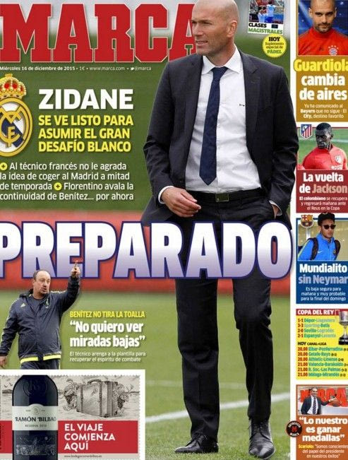 Ο υπέρτιτλος του πρώτου θέματος της εφημερίδας που πρόσκειται στους “μερένγκες” υπερθεματίζει: “Ο Ζιντάν είναι έτοιμος να αναλάβει τη μεγάλη λευκή πρόκληση”.