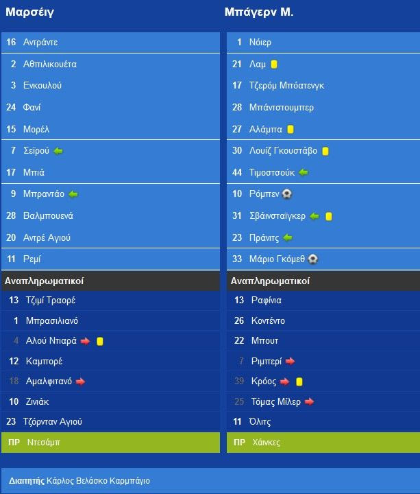 Στις αρχές του δευτέρου μέρους, η Μαρσέιγ δημιούργησε κάποιες καλές ευκαιρίες για να ισοφαρίσει, η συνέχεια όμως, ανήκε εξ ολοκλήρου στην Μπάγερν, η οποία έκανε ό,τι ήθελε στο χώρο της μεσαίας γραμμής και δίκαια έφυγε με σκορ… πρόκρισης από το “Βελοντρόμ”.