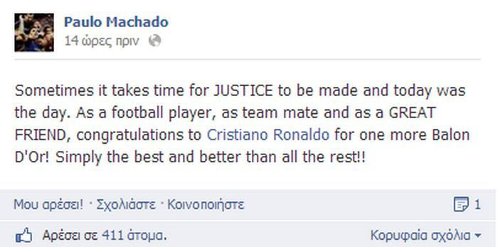 Ο Πάουλο Μασάντο δεν άφησε ασχολίαστη την απονομή της Χρυσής Μπάλας στον συμπατριώτη του, Κριστιάνο Ρονάλντο, κάνοντας λόγο για δικαιοσύνη, με ανάρτηση στη σελίδα του στο facebook.