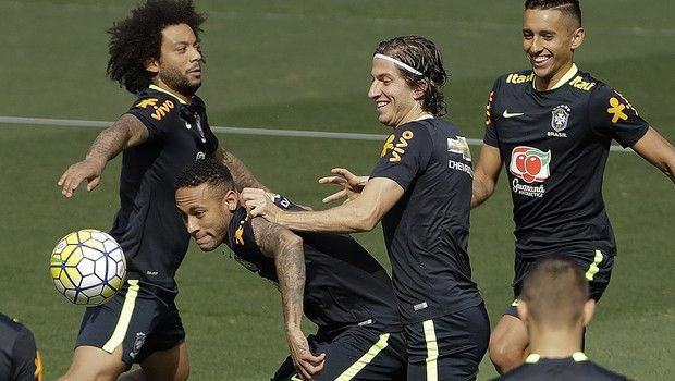Brazil's Neymar, second from left, practices with teammates Marcelo, left, Filipe Luis, and Marquinhos, right, during a training session in Belo Horizonte, Brazil, Wednesday, Nov. 9, 2016. Brazil will face Argentina in a 2018 World Cup qualifying soccer match on Thursday. (AP Photo/Andre Penner) AP