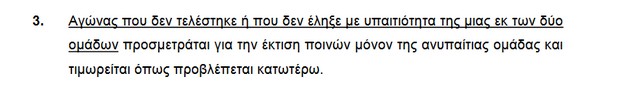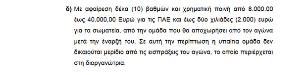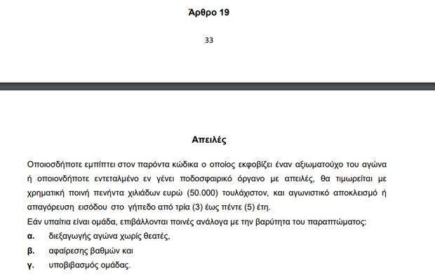 “Οποιοσδήποτε εμπίπτει στον παρόντα κώδικα ο οποίος εκφοβίζει έναν αξιωματούχο του αγώνα ή οποιονδήποτε εντεταλμένο εν γένει ποδοσφαιρικό όργανο με απειλές, θα τιμωρείται με χρηματική ποινή πενήντα χιλιάδων ευρώ (50.000) τουλάχιστον, και αγωνιστικό αποκλεισμό ή απαγόρευση εισόδου στο γήπεδο από τρία (3) έως πέντε (5) έτη.