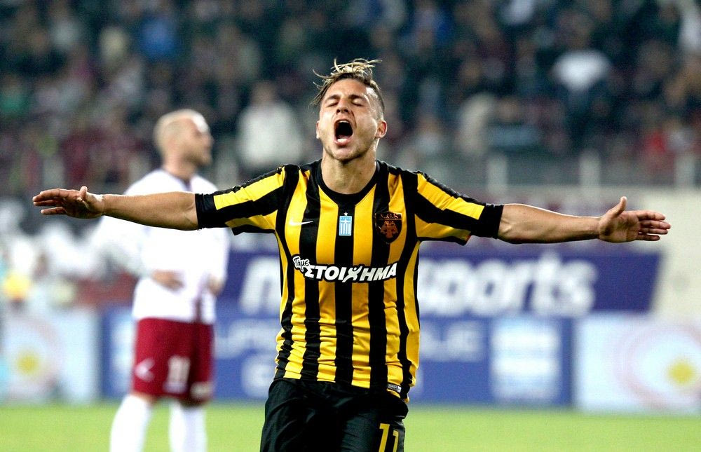 O Πλατέλλας πανηγυρίζει το δεύτερο γκολ του με τη φανέλα της ΑΕΚ.