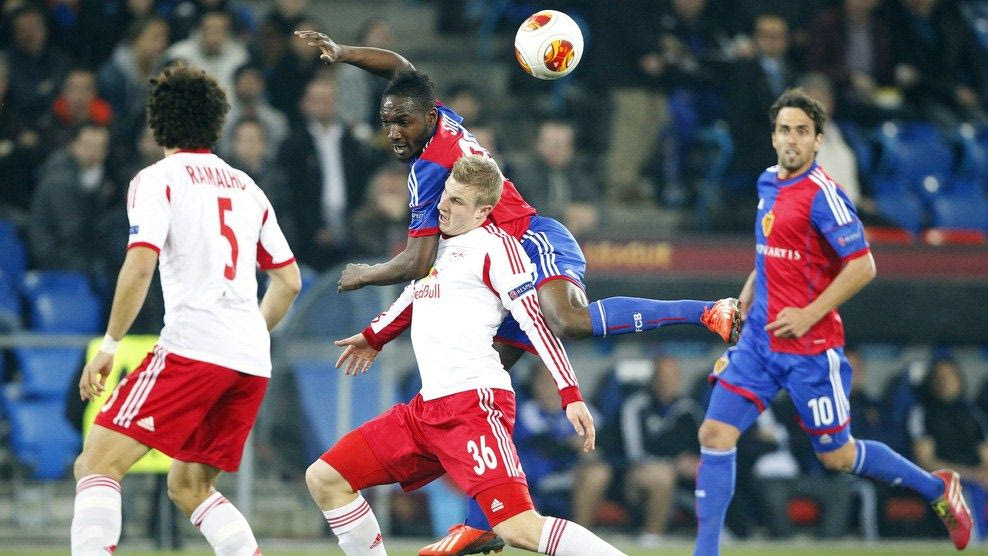 FC Basel's forward Giovanni Sio (top) fights for the ball with FC Salzburg's defender Martin Hinteregger (C) during the UEFA Europa League round of 16 first leg football match between FC Basel and FC Salzburg on March 13, 2014 in Basel. AFP PHOTO / MICHAEL BUHOLZER (Photo credit should read MICHAEL BUHOLZER/AFP/Getty Images) AFP/Getty Images