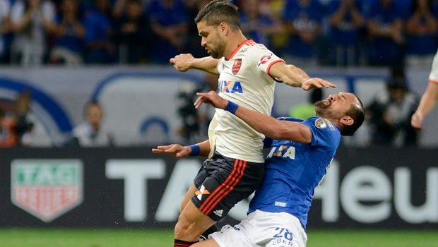 Diego of Brazil's Flamengo, left, fights for the ball with Hernan Barcos of Brazil's Cruzeiro during a Copa Libertadores soccer game in Belo Horizonte, Brazil, Wednesday, Aug. 29, 2018. (AP Photo/Eugenio Savio) AP Photo/Eugenio Savio