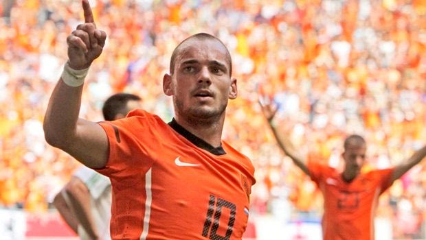 FILE - In this Saturday June 5, 2010 file photo Wesley Sneijder of The Netherlands celebrates scoring during the friendly soccer match Netherlands versus Hungary at ArenA stadium in Amsterdam, Netherlands. Midfielder Wesley Sneijder is retiring from international football after 15 years and a record 133 appearances for the Netherlands. The Dutch football association announced the retirement Sunday after new coach Ronald Koeman visited 33-year-old Sneijder in Qatar, where he plays for Al Gharafa. (AP Photo/Peter Dejong) AP Photo/Peter Dejong