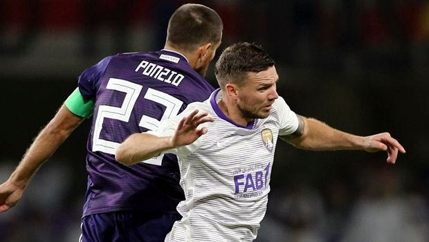 Argentina's River Plate Leonardo Ponzio jumps for the ball with Emirates's Al Ain Marcus Berg, right, during the Club World Cup semifinal soccer match between Al Ain Club and River Plate at the Hazza Bin Zayed stadium in Al Ain, United Arab Emirates, Tuesday, Dec. 18, 2018. (AP Photo/Kamran Jebreili) AP Photo/Kamran Jebreili