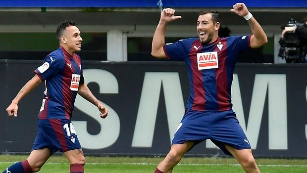 Deportivo SD Eibar's Sergi Enrich, right, celebrates after scoring his team's second goal of the game during the Spanish La Liga soccer match between Real Madrid and SD Eibar at Ipurua stadium, in Eibar, northern Spain, Saturday, Nov. 24, 2018. (AP Photo/Alvaro Barrientos) AP Photo/Alvaro Barrientos